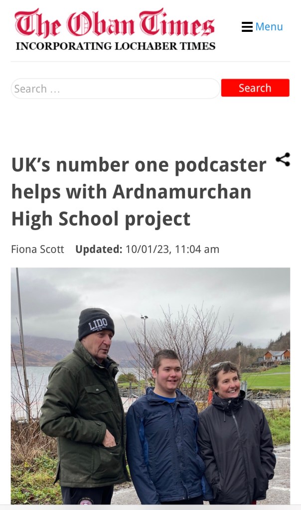 UK’s Number One Podcaster Helps Out With School Project January 12, 2023 / PAJNewman https://www.obantimes.co.uk/2023/01/10/uks-number-one-podcaster-helps-with-ardnamurchan-high-school-project/ Share this: Click to share on X (Opens in new window) X Click to share on Facebook (Opens in new window) Facebook Like Loading...